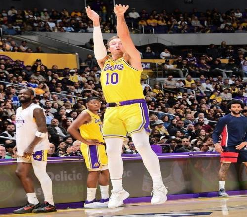 湖人隊神射手盧克肯納德,在此役強勢歸位??霞{德替補出戰(zhàn)23分鐘,10投7中,三分5中4、罰球1中1,怒砍19分2籃板1助攻1搶斷,正負值+20??霞{德以70%的命中率砍下了全隊的第二高分,并且他還以80%的命中率投進了全場最多的4記3分球。