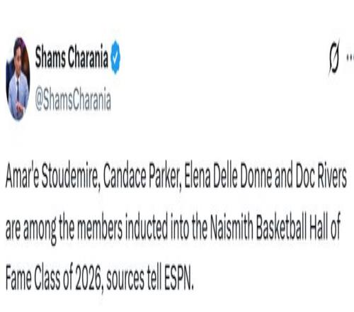 北京時間4月1日,名記Shams報道,消息人士向ESPN透露,道格-里弗斯、阿瑪雷-斯塔德邁爾、坎迪斯-帕克、埃琳娜-德勒-多恩均入選2026屆奈史密斯籃球名人堂。