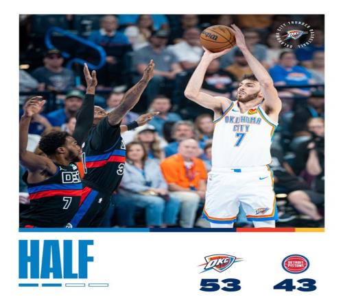 雷霆隊(duì)的亞歷山大上半場(chǎng)得到16分,霍姆格倫得到13分和5個(gè)籃板,米切爾得到10分;活塞隊(duì)的格林得到10分和4個(gè)籃板。