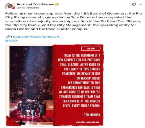 就在今天,開(kāi)拓者隊(duì)官方官宣經(jīng)NBA董事會(huì)批準(zhǔn),達(dá)拉斯億萬(wàn)富翁湯姆·鄧頓所領(lǐng)導(dǎo)的Rip City Rising所有權(quán)集團(tuán)已完成對(duì)波特蘭開(kāi)拓者隊(duì)、Rip City Remix 和 Rip City Management(摩達(dá)中心和玫瑰花園園區(qū)的運(yùn)營(yíng)實(shí)體)的多數(shù)股權(quán)收購(gòu)。