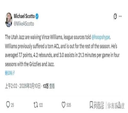 就在方才,猶他爵士隊(duì)正式對(duì)外發(fā)布一則震撼消息:處于賽季報(bào)銷狀態(tài)的后衛(wèi)文斯 - 威廉姆斯,被球隊(duì)無情裁掉!爵士做出這一決定,實(shí)在是無奈之舉。當(dāng)下,球隊(duì)內(nèi)線遭遇了前所未有的傷病危機(jī),大個(gè)子球員們仿佛被詛咒了一般,紛紛倒下,橫七豎八地傷病滿營。球隊(duì)三大中鋒凱斯勒、努爾基奇以及新援小賈倫 - 杰克遜,均因傷賽季報(bào)銷,這讓爵士的內(nèi)線瞬間變得千瘡百孔。