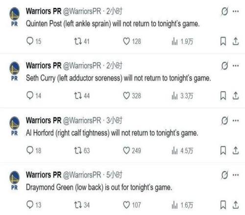 勇士下一場打尼克斯的傷病名單也出來了——