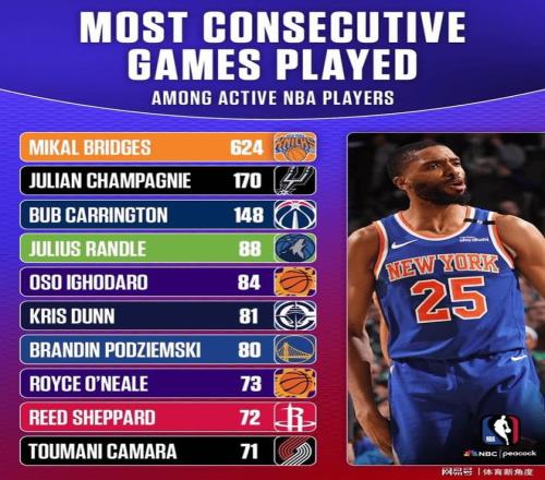 但真正令人瞠目結(jié)舌的是,除了這兩個(gè)特殊賽季,布里奇斯其余每個(gè)賽季都如同釘子戶般堅(jiān)守在球場(chǎng)上,打滿了整整82場(chǎng)。更夸張的是,2022-23賽季,由于中途被太陽(yáng)隊(duì)交易至籃網(wǎng),兩隊(duì)賽程的不期而遇,讓布里奇斯意外地多打了一場(chǎng),成就了83場(chǎng)的傳奇。至此,布里奇斯職業(yè)生涯常規(guī)賽連續(xù)出場(chǎng)次數(shù)已傲然屹立于624場(chǎng)之巔,這數(shù)字,簡(jiǎn)直比珠穆朗瑪峰還難以攀登!