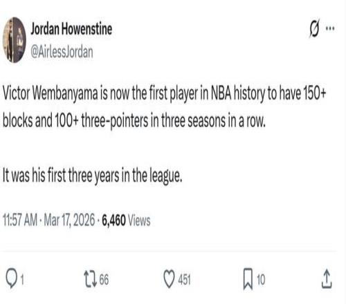 值得一提的是,文班亞馬還創(chuàng)下了NBA歷史第1神跡。數(shù)據(jù)表明:文班亞馬連續(xù)三個賽季至少150蓋帽100三分,NBA歷史首人。