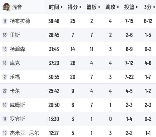反觀樂(lè)福,22中7,三分7中1,投籃這么鐵還瘋狂出手,20分7板3助4失誤3犯規(guī),正負(fù)值負(fù)14。樂(lè)福在開(kāi)拓者是雙向合同,這就是他沒(méi)能轉(zhuǎn)正的原因,依靠大量的出手來(lái)堆積數(shù)據(jù),給楊瀚森這么多球權(quán),有望30+。