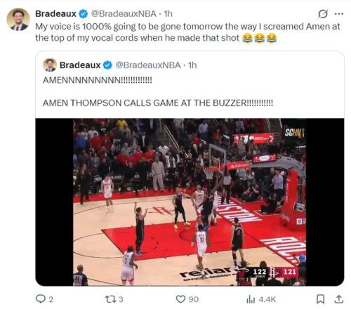 在阿門完成補(bǔ)籃絕殺后休媒高呼:明天我的嗓子肯定會啞掉,就像阿門拼命的去幫杜蘭特補(bǔ)籃一樣,我也一直在為他尖叫。