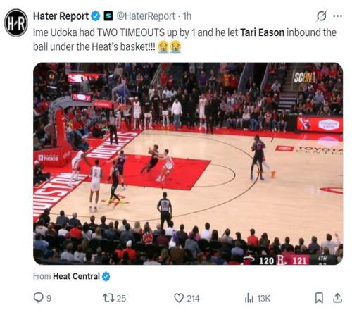 美媒嘲諷烏度卡:火箭還剩下兩個暫停,在伊森失去發(fā)球空間的情況下不叫,結(jié)果伊森助攻熱火籃下接球反超。