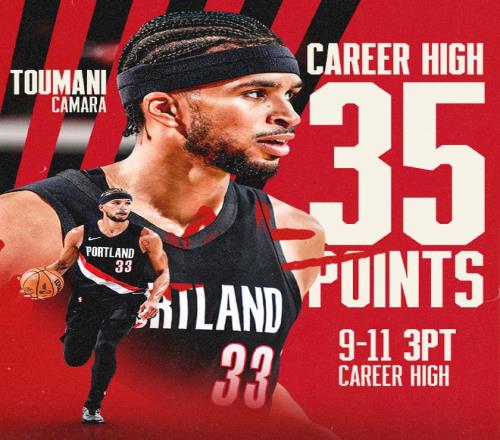 卡馬拉此役狂轟9記三分,得到全場(chǎng)最高的35分,均是創(chuàng)造生涯單場(chǎng)紀(jì)錄,率領(lǐng)開(kāi)拓者輕松大勝籃網(wǎng)。