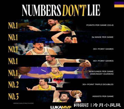 今日,湖人官方曬出了球隊后衛(wèi)盧卡東契奇本賽季的幾項數(shù)據(jù),為其爭奪mvp造勢。結(jié)果顯示東契奇本賽季場均得分(33.4分)、場均三分命中數(shù)(4記)、單場30+次數(shù)(41次)、單場40+次數(shù)(13次)均排在聯(lián)盟第一;場均籃板球數(shù)7.9個,領(lǐng)跑聯(lián)盟所有后衛(wèi);30+三雙次數(shù)(7次)排在聯(lián)盟第二,場均助攻8.4次排在聯(lián)盟第三。本賽季至今,東契奇出戰(zhàn)60場常規(guī)賽,場均上場35.9分鐘得到33.4分7.9籃板8.4助攻1.6搶斷0.6蓋帽,三項命中率為47.4%、36.4%和77.2%。