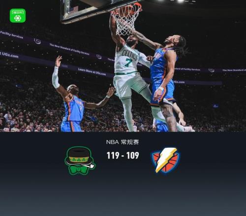 第四節(jié)凱爾特人杰倫-布朗拿下10分,雷霆卡魯索拿下7分,最終凱爾特人119-109戰(zhàn)勝雷霆
