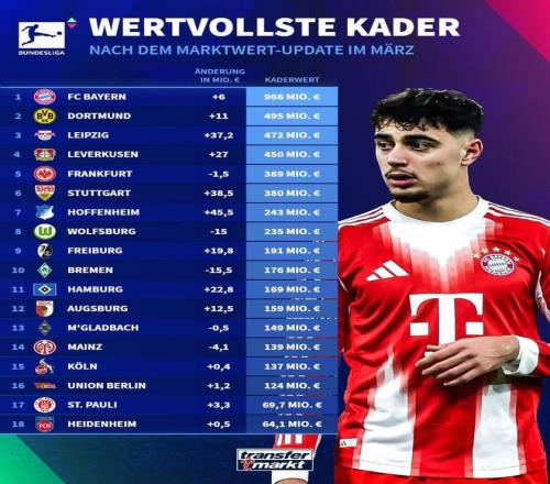 德轉更新德甲俱樂部身價榜:拜仁9.66億歐第1,多特4.95億第2