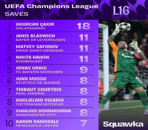 本賽季歐冠八分之一決賽兩回合撲救總數(shù)榜: