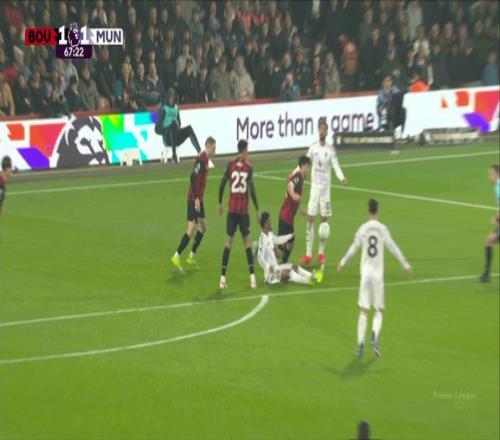 當時,1-0領先的曼聯(lián)攻入伯恩茅斯禁區(qū),布魯諾·費爾南德斯妙傳阿馬德·迪亞洛,后者順勢帶入禁區(qū),在阿德里安·特魯弗爾又拉又推之下倒地了。主裁斯圖爾特·阿特維爾沒有吹犯規(guī),伯恩茅斯得球反擊,并且取得進球。