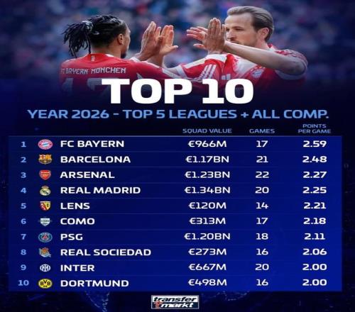 北京時(shí)間3月24日,德轉(zhuǎn)統(tǒng)計(jì)出了2026年至今歐洲五大聯(lián)賽球隊(duì)各項(xiàng)賽事場(chǎng)均積分前10名,拜仁慕尼黑以2.59分高居第一,巴塞羅那以2.48分排名第二,阿森納2.27分排名第三。